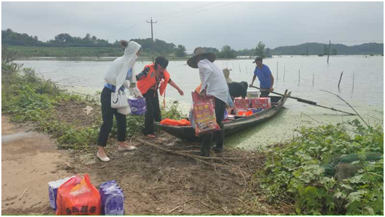 7月13日,民盟浠水工委专职副主委方卫红带领盟员企业家尚华栋、陈志中、胡建良排除交通困难,乘坐小木船到村了解灾情,开展防汛抗灾生产自救工作,并为受灾群众运去矿泉水、方便面、牛奶、面包和金银花露等3000余元慰问物资。
