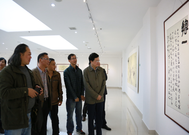 11月6日,民盟湖北省主委、副省长郭生练在宜昌考察调研期间,由民盟宜昌市委主委、市人大副主任陈和春、民建宜昌市委主委、宜昌市副市长王应华一行陪同,赴宜昌市群艺馆参观正在举办的“历史•未来,纪念世界反法西斯战争暨中国人民抗日战争胜利70周年——民盟宜昌书画院首届作品展”。