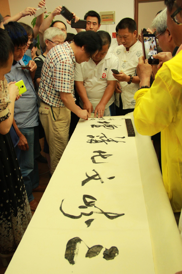 图为周德聪教授现场书写“三峡文化讲坛”字幅赠与宜昌市图书馆
