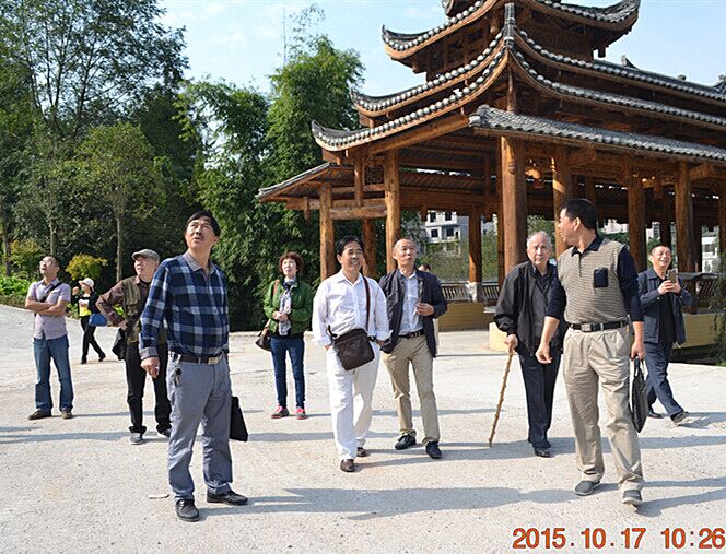 盟员一行首先来到芭蕉侗族乡新建落成的民俗文化广场参观调研。靓丽的广场上学练跆拳道的孩子们、村民们在广场上悠闲自在散步的闲适生活、清风中曼舞飘动的柳条、广场边缓缓流淌的清清河水的人文景观和自然风光以及崭新且布局合理的特色民居深深迷住了实地调研的盟员们。昔日的田土水沟,变成了眼前诗画般的美景,盟员们赞叹不已。随后,盟员一行又前往位于芭蕉侗族乡高拱桥村建设中的恩施林博园夷水侗乡建设项目工地参观调研。