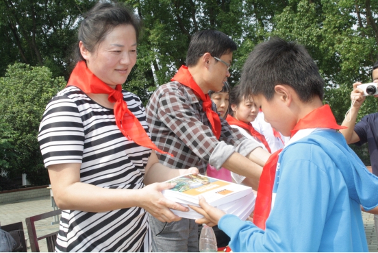 一本本带着绵绵爱意、殷殷希望的新书,从盟员手中赠送到中湾小学每个小学生手中。同学们人人笑逐颜开,“我的是作文书”、“我的是《小王子》”、“我的是世界名著,里面还有插图呢”。同学们拿到书之后叽叽喳喳地交流着。他们个个像领了“奖”似的。人手一册新书,这是六·一儿童节,民盟鄂州市委送给这些留守儿童最好的礼物!