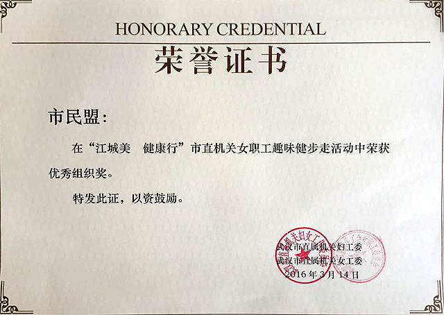 3月11日,民盟武汉市委组织机关干部参加了“江城美 健康行”市直机关女职工趣味健步走活动,充分体现了“我参与、我运动、我健康、我快乐”的运动精神,展现了民盟机关的和谐氛围和机关干部的良好精神风貌。近日,武汉市直机关妇女工作委员会颁发了《关于“江城美 健康行”市直机关女职工趣味健步走活动获奖情况的通报》,民盟武汉市委荣获优秀组织奖。(民盟武汉市委)