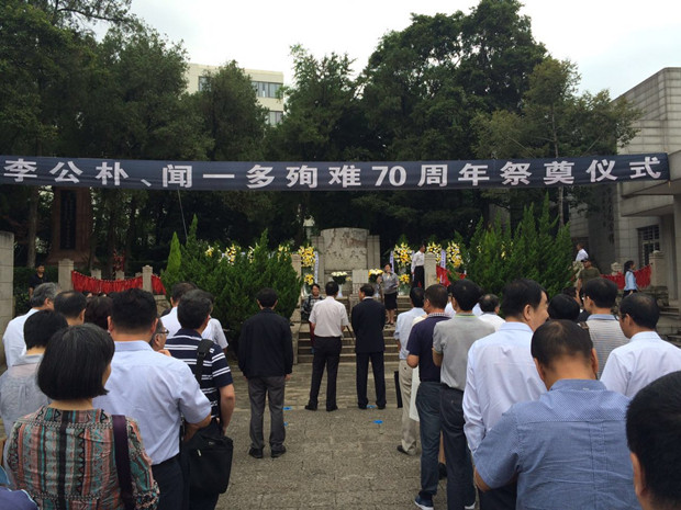 民盟湖北省委专职副主委王耀辉、民盟黄冈市委主委陈少敏出席纪念大会,王耀辉专职副主委受邀在在座谈会上发言。王耀辉专职副主委在发言中说,李公朴、闻一多的伟大牺牲精神是民盟的精神财富,也为我们昭示了今后的方向,我们要勇敢肩负起时代赋予我们的责任。陈少敏主委作为闻一多家乡代表向闻一多衣冠冢敬献花篮!(宣传部)