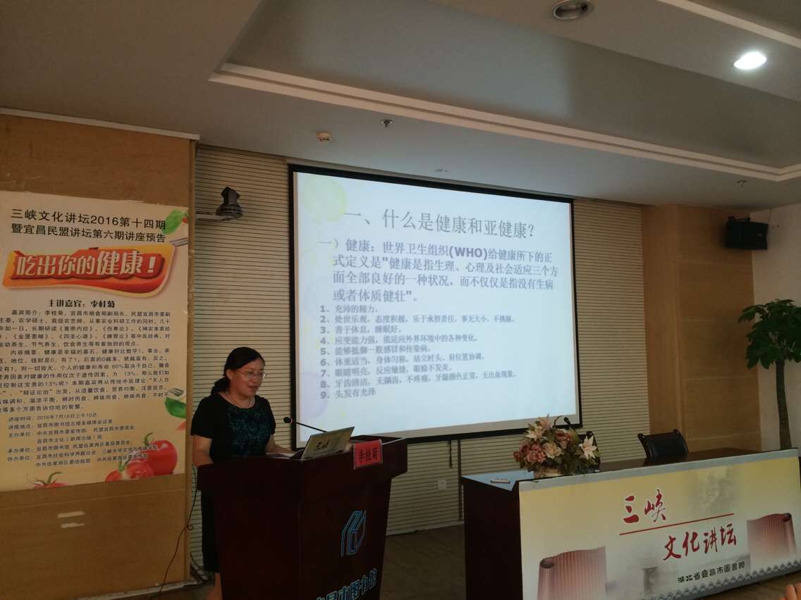当前位置:首页 > 市州传真7月16日上午,由民盟市委主办、民盟伍家岗区基层委员会承办的宜昌民盟讲坛2016年第一讲,在宜昌市图书馆五楼多媒体会议室顺利开讲。民盟市委副主委、宜昌市粮食局副局长李桂菊,作了“吃出你的健康来”专题讲座,民盟市委会秘书长万平应邀参加。
