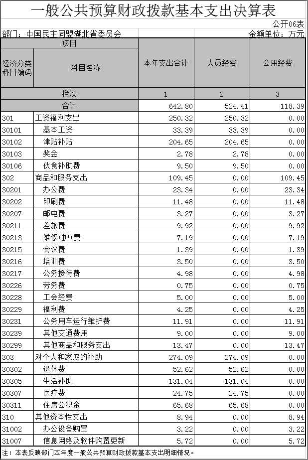 6、民盟湖北省委员会2015年一般公共预算财政拨款基本支出决算表(公开06表)