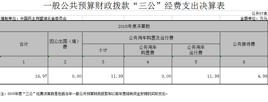 7、民盟湖北省委员会2015年一般公共预算财政拨款“三公”经费支出决算表(公开07表)