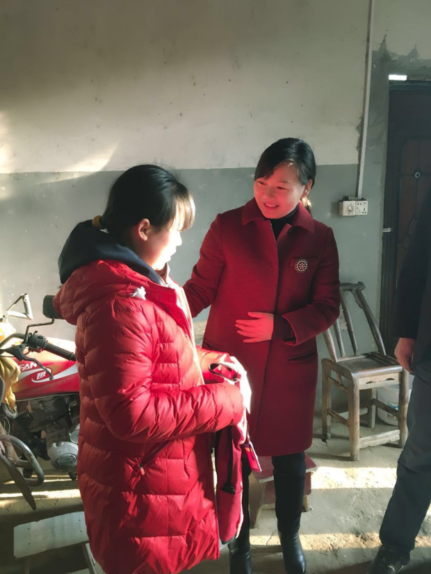 农历春节前,团风民盟一行前往贾庙、杜皮山区,向当地福利院及贫困学生送去了米、油、新衣、书包及慰问金。图为团风民盟主委黄菊花在关心孩子的学习情况。(杨登君)