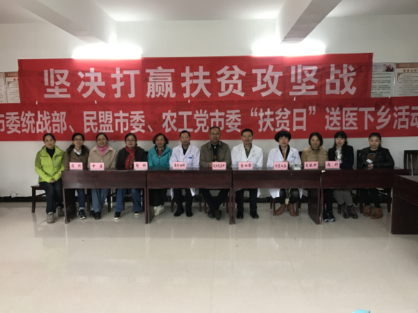 2017年10月17日上午,民盟和农工党的10位医疗专家在统战部领导的带领下冒着大雨赶赴郧西县小河村,为村民免费送医送药,受到了村民们的热烈欢迎。在活动现场,闻讯赶来看病咨询的村民络绎不绝,医疗专家们认真仔细为村民做出病情诊断,开具良方并耐心回答村民的提问,用自己精湛的医术为贫困地区的群众送去了温暖和关怀。民盟十堰市人民医院支部主委廖勇敢、盟员徐萍、王雪和人民医院医生谢辉参加了此次活动,他们高超的医术收到了村民们的好评。