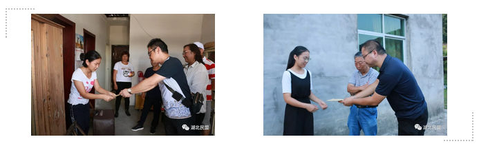 调研组走进园岭山村首先走访看望了民盟省委对口帮扶的7户贫困户,为他们送去了生活慰问品,并登门向受到帮扶今年考上大学的贫困户学生张英和张超表示祝贺。民盟省委直属江南委员会继续为帮扶的3户贫困户学子送去了助学款。
