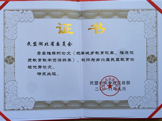 本届论坛共收到论文120余篇,经专家认真评审和论证,评选出优秀论文27篇。民盟湖北省委提交的论文《统筹城乡教育改革,推进优质教育教学资源共享》获优秀论文奖,民盟省委副主委陈少敏代表民盟湖北省委上台领奖。