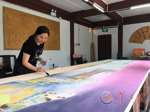 当前位置:首页 > 盟员风采民盟襄阳市委同心书画院副院长孙莉群耗时3个月,近日完成了巨幅水彩画作《紫云揽襄》。10月29日,记者在位于米公祠的一间画室里见到了这幅作品。这幅作品长450厘米,高150厘米,涵盖了襄阳多处人文景观。
