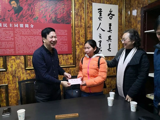 当前位置:首页 > 盟员风采12月22日,在“冬至”这个特殊的节日里,民盟湖北省委直属知音支部的“盟员之家”迎来一位特殊的“小成员”,她就是民盟省委开展精准扶贫驻点村十堰郧阳区青山镇园岭山村重点帮扶的贫困家庭的学子,2018年考入襄阳职业技术学院临床医学专业的大一学生张英同学。民盟湖北省委直属知音支部积极响应盟省委号召,参与精准扶贫、助学圆梦的帮扶活动,于“冬至”当日,特邀请张英同学来到位于武汉市汉阳区的文化创意产业园中知音支部“盟员之家”举行了助学金发放仪式,这同时也是知音支部帮扶行动的启动仪式。