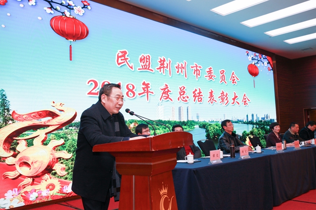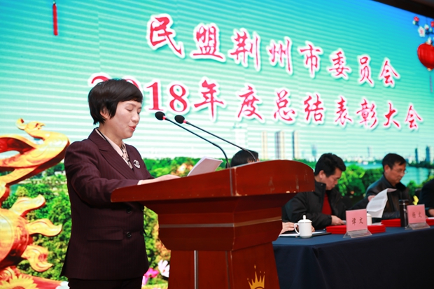 中共荆州市委统战部常务副部长赵永琴到会祝贺并发表热情洋溢的讲话。赵部长对盟市委2018年工作表示了高度的肯定,希望全市各级盟组织和广大盟员继续发挥优势,双岗建功,以优异的工作成绩迎接中华人民共和国成立70周年。
