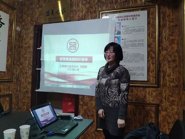 知音支部盟员,中国工商银行武汉分行内控合规部反洗钱科科长刘冠嵘宣讲反洗钱金融知识。
