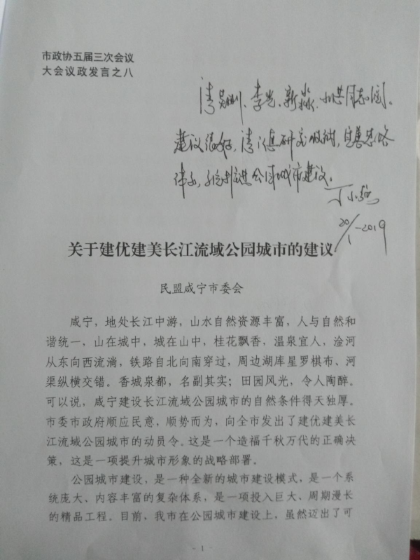 1月20日上午,咸宁市政协五届三次全会上,民盟咸宁市委员会专职副主委吴宏钧代表民盟咸宁市委以《关于建优精美长江流域公园城市的建议》为题作了大会议政发言。