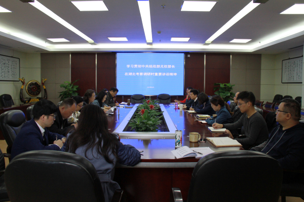 当前位置:首页 > 省盟要闻 4月15日至17日,中央书记处书记、中央统战部部长尤权同志到湖北省考察调研并发表重要讲话。按照中共湖北省委统战部关于贯彻落实尤权部长重要讲话精神的意见要求,民盟湖北省委杨云彦主委第一时间作出工作部署,组织主委会班子成员带头学习贯彻落实尤权部长考察调研湖北时的重要讲话精神,并研究制定民盟省委贯彻落实尤权部长考察湖北时的重要讲话精神工作方案。同时要求民盟省委机关和全省各级民盟组织迅速行动起来,贯彻落实尤权部长在湖北考察调研时的重要讲话精神,研究贯彻措施,作出具体安排,确保学习宣传到位、贯彻落实到位。
