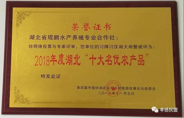 经过多年的努力合作社汈牌大闸蟹荣获湖北省合作社十大品牌、湖北省十大名优农产品,是孝感地区唯一入选的农产品品牌。