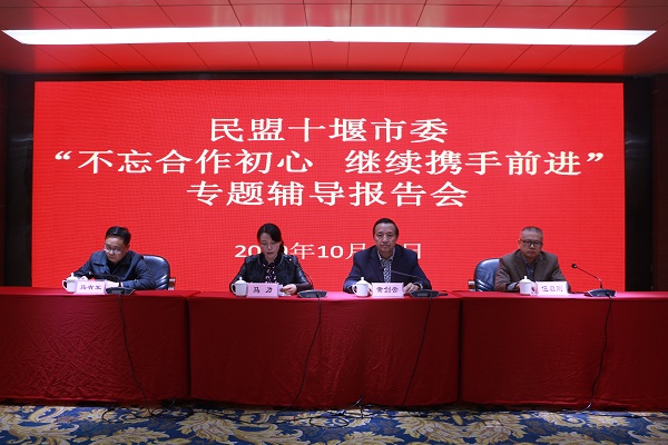 当前位置:首页 > 市州传真10月26日下午,民盟十堰市委在市堰丰宾馆7楼会议室举办“不忘合作初心,继续携手前进”主题教育活动专题辅导报告会,市政协副主席、民盟市委主委黄剑云作了“不忘合作初心,继续携手前进,为建设高素质参政党队伍努力奋斗”的专题辅导报告。市委委员、各基层组织领导班子成员、部分骨干盟员和2019年新发展盟员参加了学习,会议由副主委马力主持。