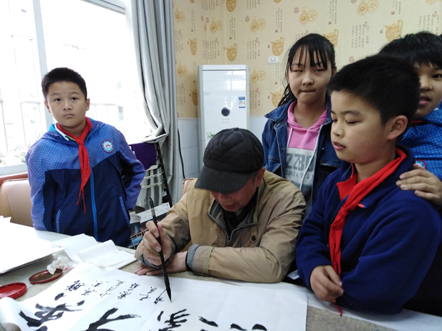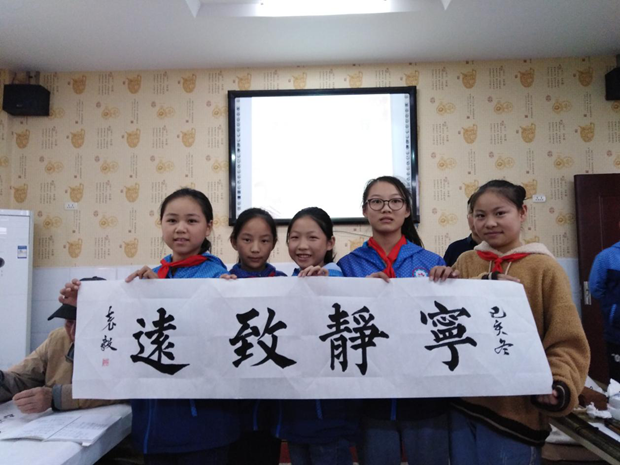老师们,辛苦了!莲花小学校长陈四群看到己是八十高龄的民盟老书法家周启昆为一位小学生题写完“英才豪杰”四字时,连声叫好,鼓掌致谢并邀请书画家们与教师们一起合影。