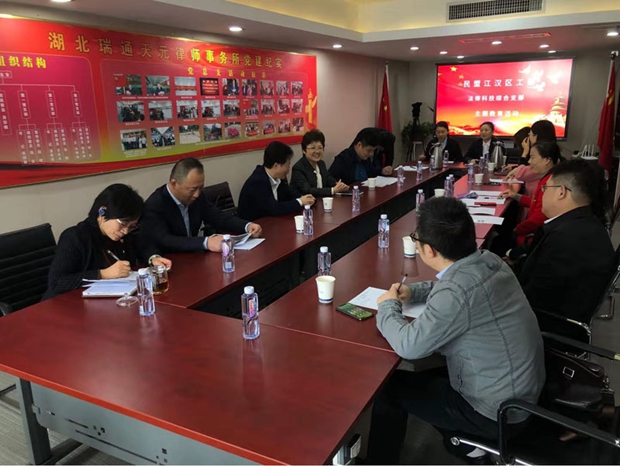 当前位置:首页 > 基层动态11月13日,民盟江汉区工委科技法律综合支部在湖北瑞通天元律师事务所开展“不忘合作初心,继续携手前进”主题教育活动,参加活动的有该支部盟员,江汉区政协副主席、江汉区工委主委沈玲,民盟武汉市委会联络员张如玲应邀参加了会议;会议还特邀请湖北瑞通天元律师事务所党总支书记、主任崔宝顺,党总支副书记胡开智两人参加了学习活动。