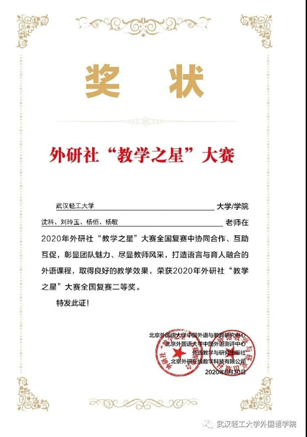 当前位置:首页 > 盟员风采6月30日,外研社“教学之星”大赛(本科英语组)全国复赛获奖名单正式发布,武汉轻工大学盟员沈科,刘玲玉参与外国语学院教师团队,团队共同创作的参赛教学作品以其新颖的思路,和独到的见解在本次大赛中荣获大学英语组全国复赛二等奖。