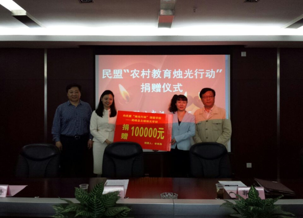 5月14日上午,民盟“农村教育烛光行动”捐赠仪式在民盟湖北省委机关会议室举行。图为民盟中央社会服务部部长郭勇、扶贫处处长刘永辉,杭州森银酒类销售有限公司董事长李银燕等领导和企业家出席捐赠仪式。