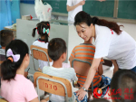 7月3日,由共青团湖北省委、湖北省教育厅、湖北广播电视台联合主办的“用我的声音做你的眼睛——2014湖北广电高校联合行动”在湖北郧县桂花小学举行。图为民盟硚口区文化支部盟员心理专家沈梦参加活动,并对学生进行专业的心理辅导。