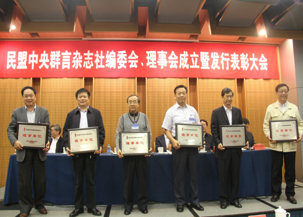 10月19日上午,民盟中央群言杂志社编委会、理事会成立暨发行表彰大会在北京召开。本次会议为《群言》编委会委员、理事会理事、通讯员颁发聘书,为理事单位授牌,向群言杂志社发行工作优秀单位代表颁奖。图为民盟省委专职副主委王耀辉代表民盟省委接受《群言》理事单位授牌和发行工作优秀单位颁奖。