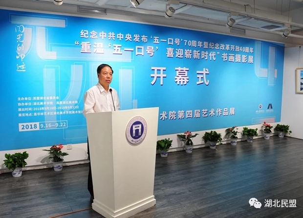 9月17日,“重温‘五一口号’、喜迎崭新时代”书画摄影展暨民盟湖北美术院第四届艺术作品展在武汉开幕。湖北省人民政府副省长、民盟湖北省委主委杨云彦,民盟中央宣传部部长曲伟,湖北美术学院党委副书记、院长许奋出席开幕式并讲话。民盟湖北美术院院长徐勇民主持开幕式。中共湖北省委统战部副部长、省社会主义学院党委书记冯艳飞,湖北美术学院党委书记梁远钢,党委副书记兼统战部部长卢斌,民盟湖北省委副主委叶春松、专职副主委朱梅出席开幕式。民盟湖北省各市州及省直各基层的100余位盟员代表参加了开幕式。